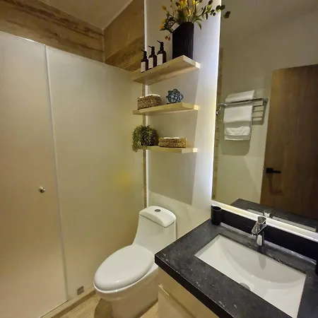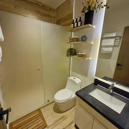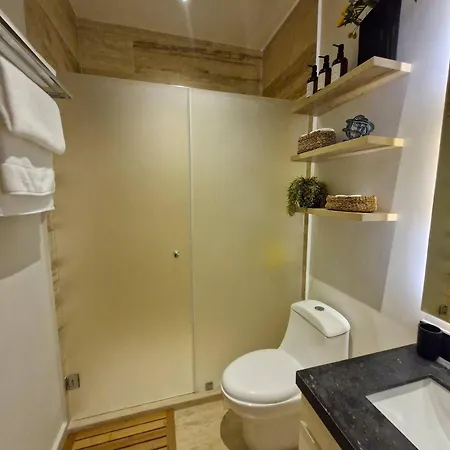 El apartamento Depa M410 Relaxing And Cozy Steps From The Beach incluye inodoro separado y ducha para tu comodidad. También encontrarás artículos de aseo gratuitos.